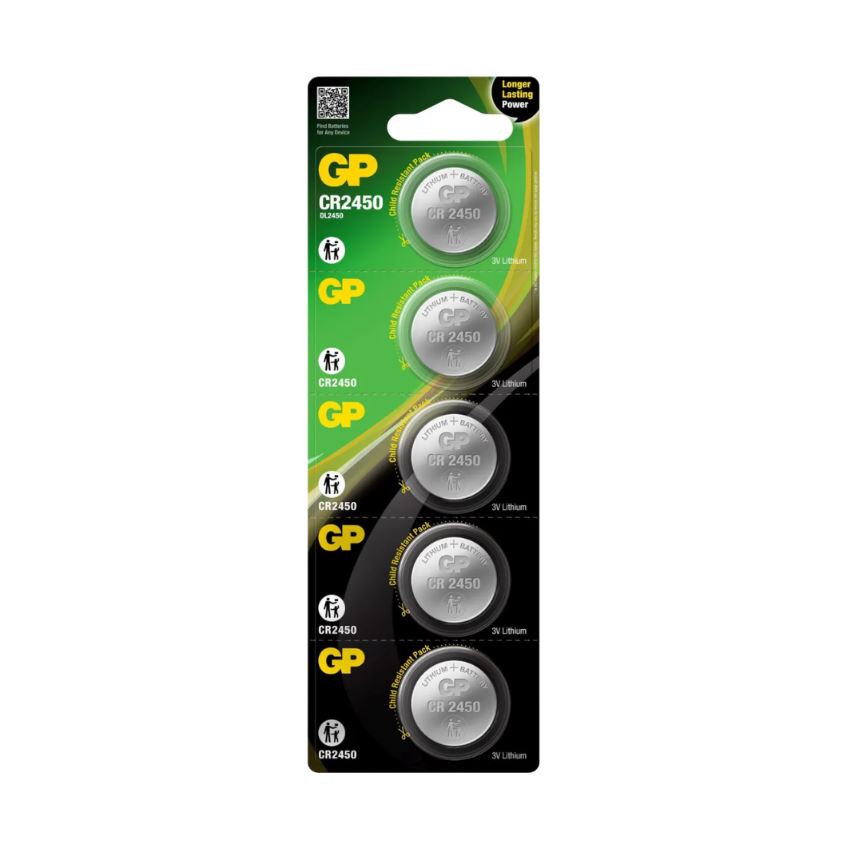 Pack de 5 pilas CR2450 GP alcalinas originales, perfectas para relojes, calculadoras, controles remotos y otros aparatos electrónicos de alto rendimiento. Energía confiable y duradera.